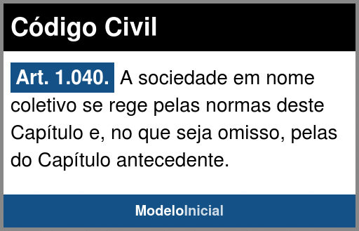 Art. 1.040. A sociedade em nome coletivo se rege pelas normas deste Capítulo e, no que seja omisso, pelas do Capítulo antecedente.