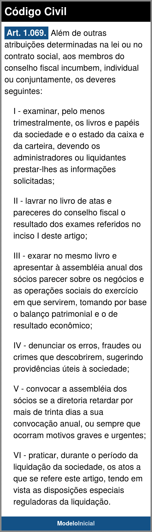 Art. 1.069. Além de outras atribuições determinadas na lei ou no contrato social, aos membros do conselho fiscal incumbem, individual ou conjuntamente, os deveres seguintes: