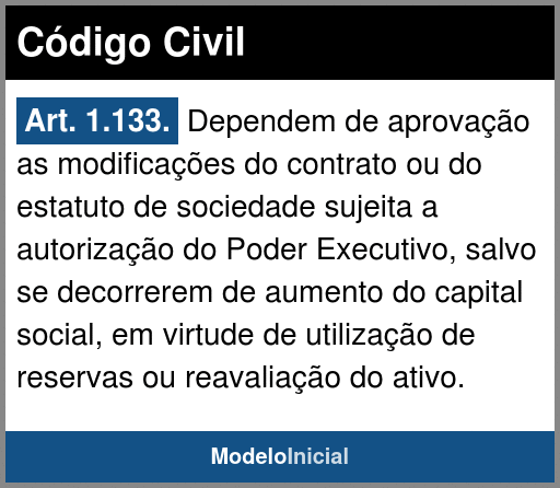 Art. 1.133. Dependem de aprovação as modificações do contrato ou do estatuto de sociedade sujeita a autorização do Poder Executivo, salvo se decorrerem de aumento do capital social, em virtude de utilização de reservas ou reavaliação do ativo.