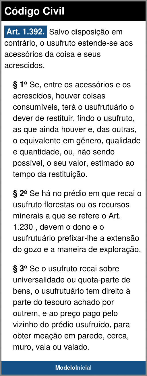 Art. 1.392. Salvo disposição em contrário, o usufruto estende-se aos acessórios da coisa e seus acrescidos.