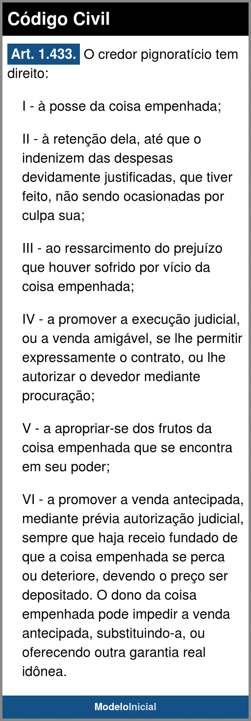 VI - a promover a venda antecipada, mediante prévia autorização judicial, sempre que haja receio fundado de que a coisa empenhada se perca ou deteriore, devendo o preço ser depositado. O dono da coisa empenhada pode impedir a venda antecipada, substituindo-a, ou oferecendo outra garantia real idônea.