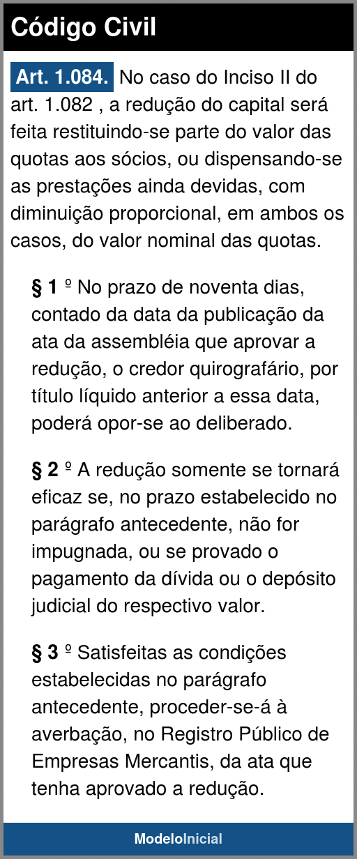 Art. 1.084. No caso do Inciso II do art. 1.082, a redução do capital será feita restituindo-se parte do valor das quotas aos sócios, ou dispensando-se as prestações ainda devidas, com diminuição proporcional, em ambos os casos, do valor nominal das quotas.