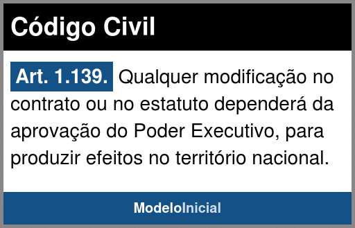 Art. 1.139. Qualquer modificação no contrato ou no estatuto dependerá da aprovação do Poder Executivo, para produzir efeitos no território nacional.