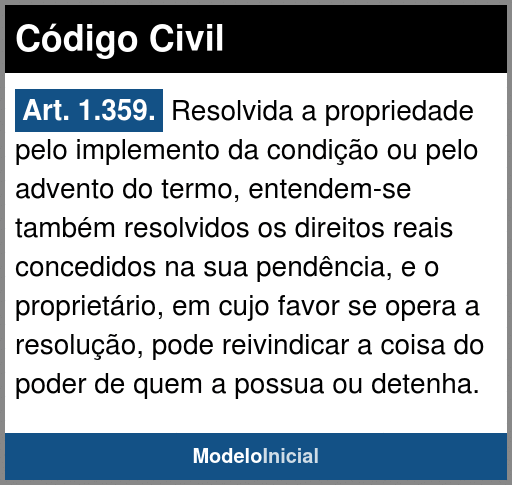 Art. 1.359. Resolvida a propriedade pelo implemento da condição ou pelo advento do termo, entendem-se também resolvidos os direitos reais concedidos na sua pendência, e o proprietário, em cujo favor se opera a resolução, pode reivindicar a coisa do poder de quem a possua ou detenha.