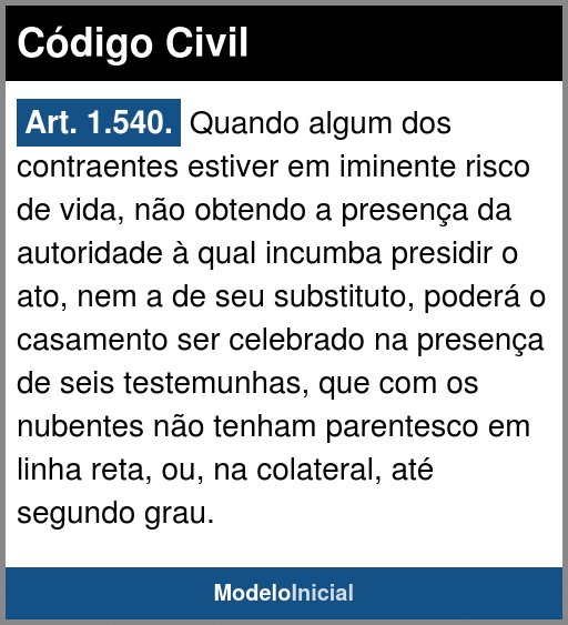 Art. 1.540. Quando algum dos contraentes estiver em iminente risco de vida, não obtendo a presença da autoridade à qual incumba presidir o ato, nem a de seu substituto, poderá o casamento ser celebrado na presença de seis testemunhas, que com os nubentes não tenham parentesco em linha reta, ou, na colateral, até segundo grau.