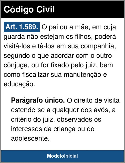Art. 1.589. O pai ou a mãe, em cuja guarda não estejam os filhos, poderá visitá-los e tê-los em sua companhia, segundo o que acordar com o outro cônjuge, ou for fixado pelo juiz, bem como fiscalizar sua manutenção e educação.