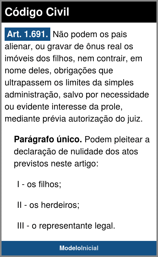 Art. 1.691. Não podem os pais alienar, ou gravar de ônus real os imóveis dos filhos, nem contrair, em nome deles, obrigações que ultrapassem os limites da simples administração, salvo por necessidade ou evidente interesse da prole, mediante prévia autorização do juiz.
