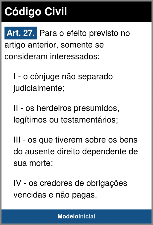 LEGITIMIDADE: Para fins de abertura da sucessão provisória ou definitiva, nos termos do Art. 27 do Código Civil, somente se consideram interessados: I - o cônjuge não separado judicialmente; II - os herdeiros presumidos, legítimos ou testamentários; III - os que tiverem sobre os bens do ausente direito dependente de sua morte; IV - os credores de obrigações vencidas e não pagas.