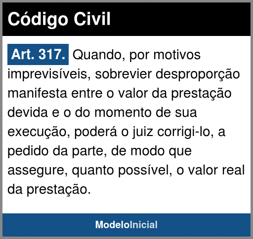 Art. 317. Quando, por motivos imprevisíveis, sobrevier desproporção manifesta entre o valor da prestação devida e o do momento de sua execução, poderá o juiz corrigi-lo, a pedido da parte, de modo que assegure, quanto possível, o valor real da prestação.