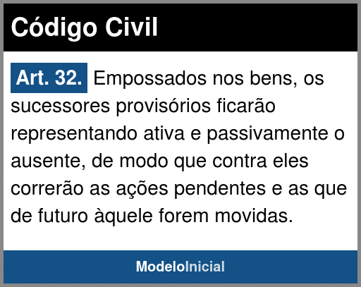 Art. 32. Empossados nos bens, os sucessores provisórios ficarão representando ativa e passivamente o ausente, de modo que contra eles correrão as ações pendentes e as que de futuro àquele forem movidas.