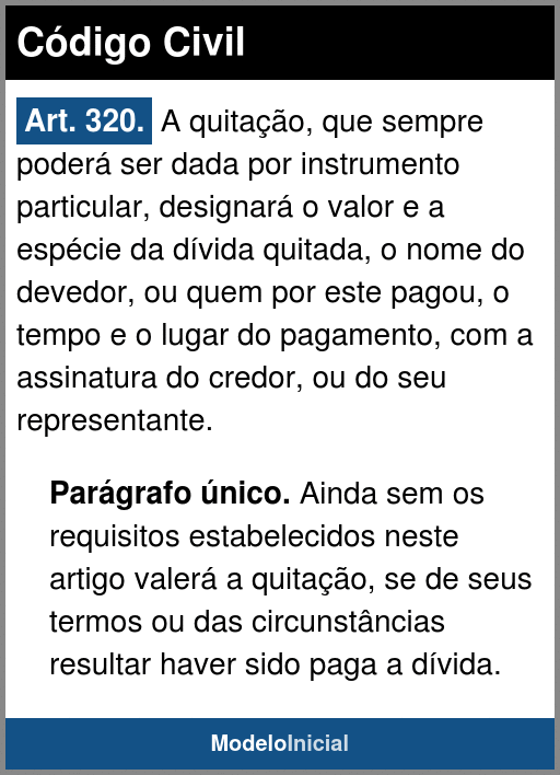 Art. 320. A quitação, que sempre poderá ser dada por instrumento particular, designará o valor e a espécie da dívida quitada, o nome do devedor, ou quem por este pagou, o tempo e o lugar do pagamento, com a assinatura do credor, ou do seu representante.