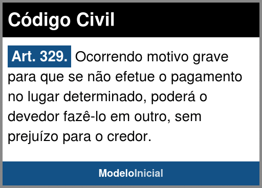Art. 329. Ocorrendo motivo grave para que se não efetue o pagamento no lugar determinado, poderá o devedor fazê-lo em outro, sem prejuízo para o credor.