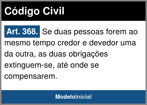 Art. 368. Se duas pessoas forem ao mesmo tempo credor e devedor uma da outra, as duas obrigações extinguem-se, até onde se compensarem.