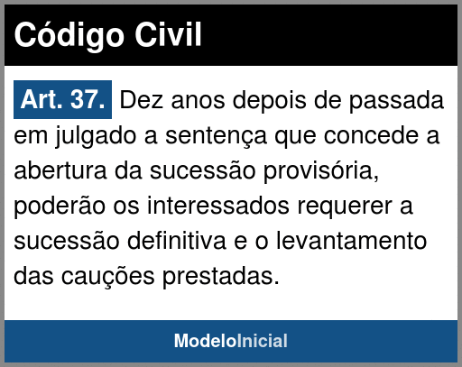 Art. 37. Dez anos depois de passada em julgado a sentença que concede a abertura da sucessão provisória, poderão os interessados requerer a sucessão definitiva e o levantamento das cauções prestadas.