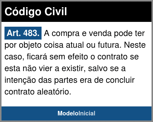 Art. 483. A compra e venda pode ter por objeto coisa atual ou futura. Neste caso, ficará sem efeito o contrato se esta não vier a existir, salvo se a intenção das partes era de concluir contrato aleatório.