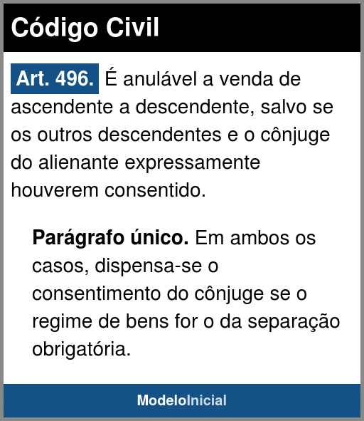 Art. 496. É anulável a venda de ascendente a descendente, salvo se os outros descendentes e o cônjuge do alienante expressamente houverem consentido.
