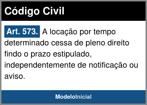 Art. 573. A locação por tempo determinado cessa de pleno direito findo o prazo estipulado, independentemente de notificação ou aviso.