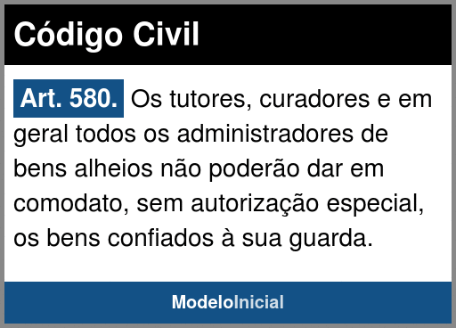 Art. 580. Os tutores, curadores e em geral todos os administradores de bens alheios não poderão dar em comodato, sem autorização especial, os bens confiados à sua guarda.