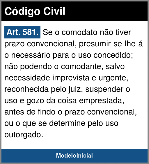 Se o comodato não tiver prazo convencional, presumir-se-lhe-á o necessário para o uso concedido; não podendo o comodante, salvo necessidade imprevista e urgente, reconhecida pelo juiz, suspender o uso e gozo da coisa emprestada, antes de findo o prazo convencional, ou o que se determine pelo uso outorgado. (Art. 581 CC)