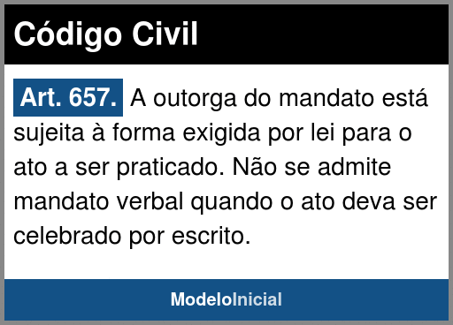 Art. 657. A outorga do mandato está sujeita à forma exigida por lei para o ato a ser praticado. Não se admite mandato verbal quando o ato deva ser celebrado por escrito.