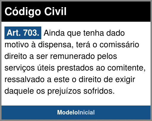 Art. 703. Ainda que tenha dado motivo à dispensa, terá o comissário direito a ser remunerado pelos serviços úteis prestados ao comitente, ressalvado a este o direito de exigir daquele os prejuízos sofridos.
