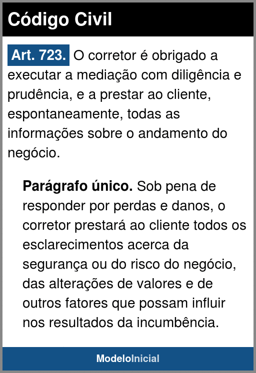 Art. 723. O corretor é obrigado a executar a mediação com diligência e prudência, e a prestar ao cliente, espontaneamente, todas as informações sobre o andamento do negócio.