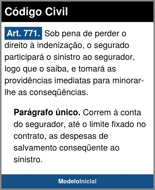 Art. 771. Sob pena de perder o direito à indenização, o segurado participará o sinistro ao segurador, logo que o saiba, e tomará as providências imediatas para minorar-lhe as conseqüências.