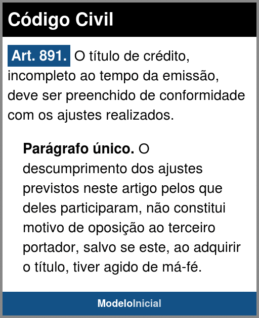 Art. 891. O título de crédito, incompleto ao tempo da emissão, deve ser preenchido de conformidade com os ajustes realizados.