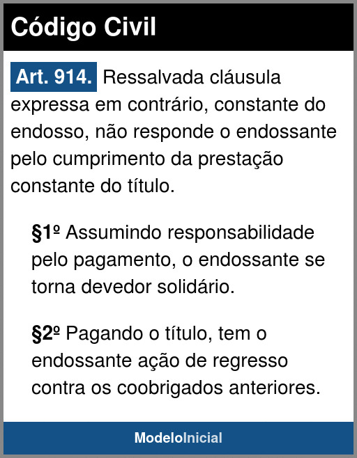 Art. 914. Ressalvada cláusula expressa em contrário, constante do endosso, não responde o endossante pelo cumprimento da prestação constante do título.