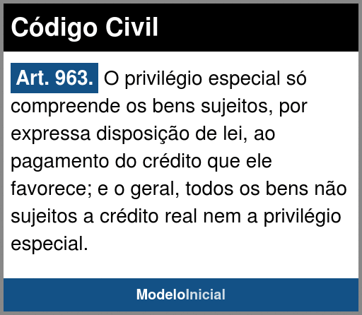 Art. 963. O privilégio especial só compreende os bens sujeitos, por expressa disposição de lei, ao pagamento do crédito que ele favorece; e o geral, todos os bens não sujeitos a crédito real nem a privilégio especial.