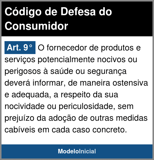 Art. 9° O fornecedor de produtos e serviços potencialmente nocivos ou perigosos à saúde ou segurança deverá informar, de maneira ostensiva e adequada, a respeito da sua nocividade ou periculosidade, sem prejuízo da adoção de outras medidas cabíveis em cada caso concreto.