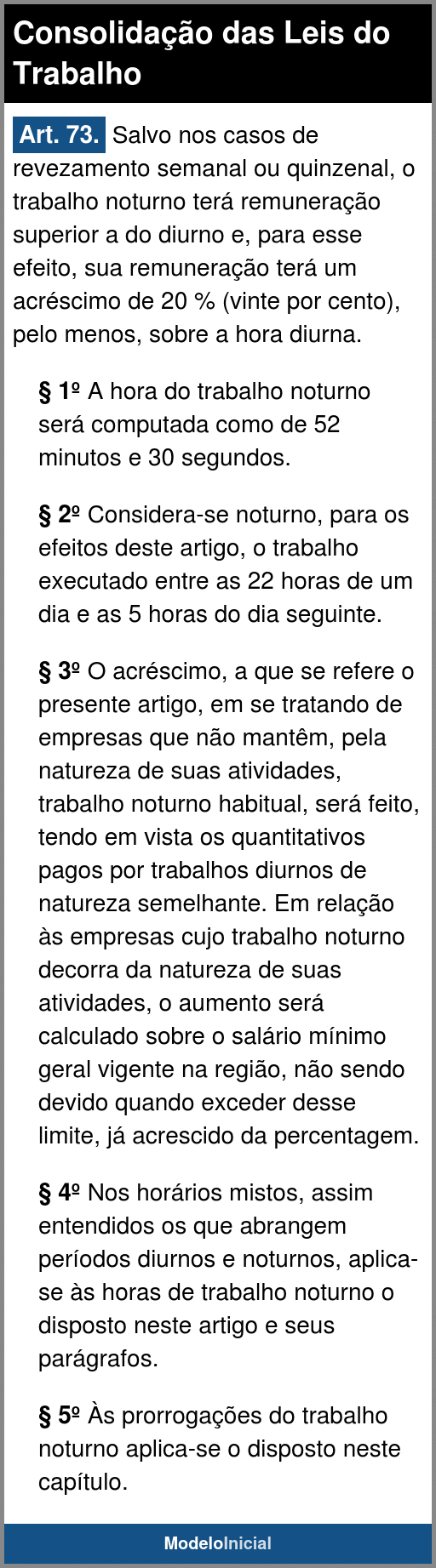 Art. 73. Salvo nos casos de revezamento semanal ou quinzenal, o trabalho noturno terá remuneração superior a do diurno e, para esse efeito, sua remuneração terá um acréscimo de 20 % (vinte por cento), pelo menos, sobre a hora diurna.