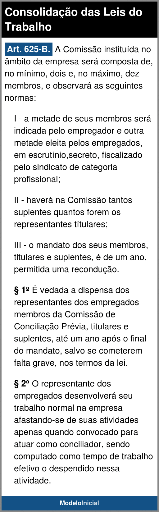 Art. 625-B. A Comissão instituída no âmbito da empresa será composta de, no mínimo, dois e, no máximo, dez membros, e observará as seguintes normas:
