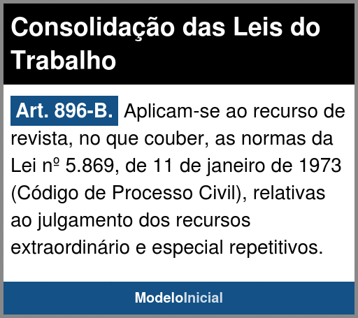 Art. 896-B. Aplicam-se ao recurso de revista, no que couber, as normas da Lei nº 5.869, de 11 de janeiro de 1973 (Código de Processo Civil), relativas ao julgamento dos recursos extraordinário e especial repetitivos.