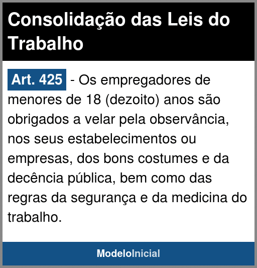 Art. 425 - Os empregadores de menores de 18 (dezoito) anos são obrigados a velar pela observância, nos seus estabelecimentos ou empresas, dos bons costumes e da decência pública, bem como das regras da segurança e da medicina do trabalho.