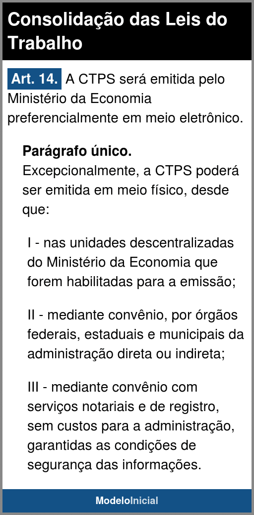 Art. 14. A CTPS será emitida pelo Ministério da Economia preferencialmente em meio eletrônico.