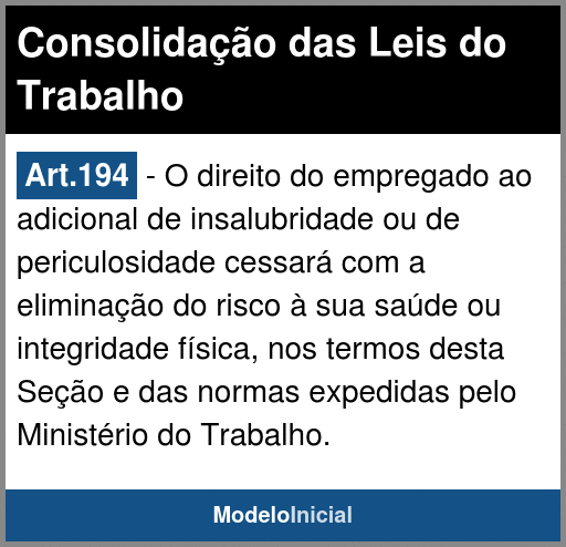 Art.194 - O direito do empregado ao adicional de insalubridade ou de periculosidade cessará com a eliminação do risco à sua saúde ou integridade física, nos termos desta Seção e das normas expedidas pelo Ministério do Trabalho.