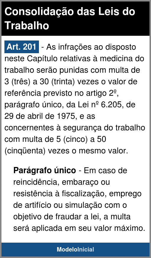 Art. 201 - As infrações ao disposto neste Capítulo relativas à medicina do trabalho serão punidas com multa de 3 (três) a 30 (trinta) vezes o valor de referência previsto no artigo 2º, parágrafo único, da Lei nº 6.205, de 29 de abril de 1975, e as concernentes à segurança do trabalho com multa de 5 (cinco) a 50 (cinqüenta) vezes o mesmo valor.