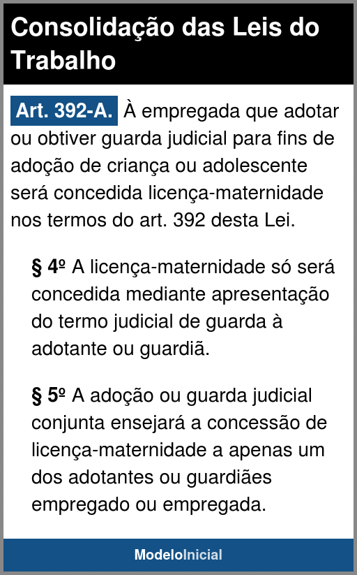 Art. 392-A. À empregada que adotar ou obtiver guarda judicial para fins de adoção de criança ou adolescente será concedida licença-maternidade nos termos do Art. 392 desta Lei.