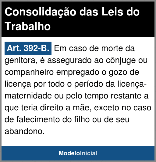 Art. 392-B. Em caso de morte da genitora, é assegurado ao cônjuge ou companheiro empregado o gozo de licença por todo o período da licença-maternidade ou pelo tempo restante a que teria direito a mãe, exceto no caso de falecimento do filho ou de seu abandono.
