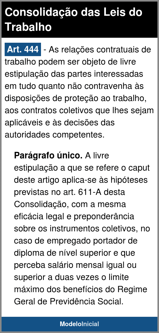 Parágrafo único. A livre estipulação a que se refere o caput deste artigo aplica-se às hipóteses previstas no Art. 611-A desta Consolidação, com a mesma eficácia legal e preponderância sobre os instrumentos coletivos, no caso de empregado portador de diploma de nível superior e que perceba salário mensal igual ou superior a duas vezes o limite máximo dos benefícios do Regime Geral de Previdência Social.