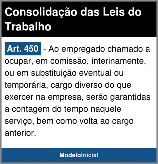 Art. 450 - Ao empregado chamado a ocupar, em comissão, interinamente, ou em substituição eventual ou temporária, cargo diverso do que exercer na empresa, serão garantidas a contagem do tempo naquele serviço, bem como volta ao cargo anterior.