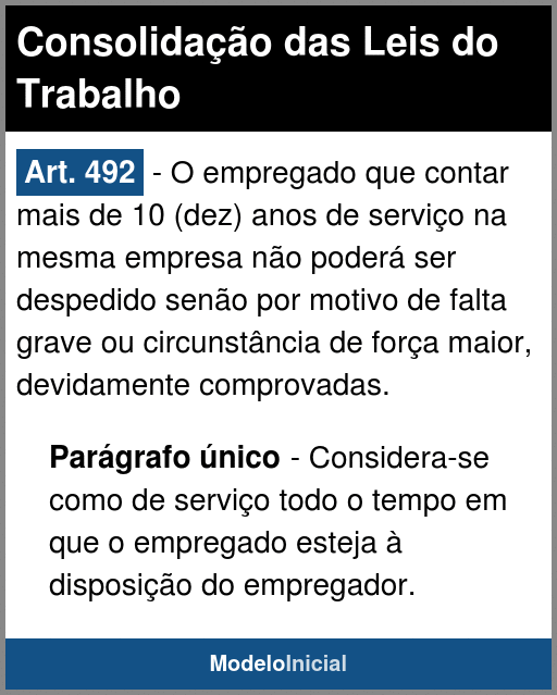 Art. 492 - O empregado que contar mais de 10 (dez) anos de serviço na mesma empresa não poderá ser despedido senão por motivo de falta grave ou circunstância de força maior, devidamente comprovadas.