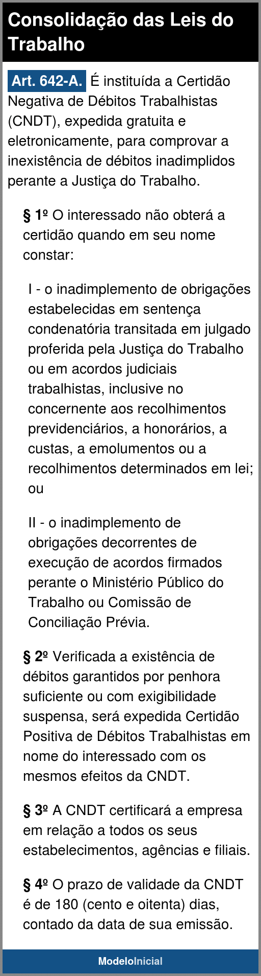 Art. 642-A. É instituída a Certidão Negativa de Débitos Trabalhistas (CNDT), expedida gratuita e eletronicamente, para comprovar a inexistência de débitos inadimplidos perante a Justiça do Trabalho.