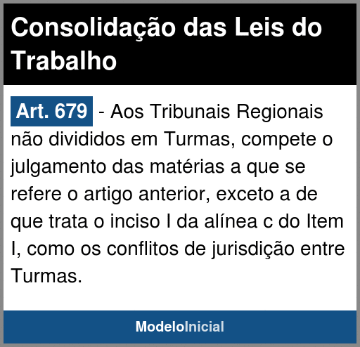 Art. 679 - Aos Tribunais Regionais não divididos em Turmas, compete o julgamento das matérias a que se refere o artigo anterior, exceto a de que trata o inciso I da alínea c do Item I, como os conflitos de jurisdição entre Turmas.