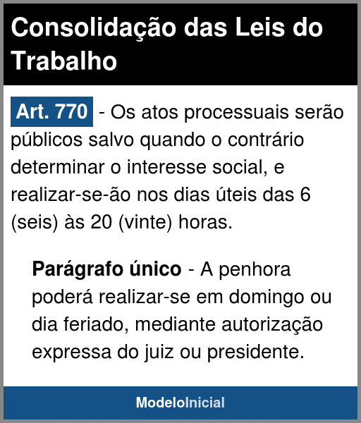 Art. 770 - Os atos processuais serão públicos salvo quando o contrário determinar o interesse social, e realizar-se-ão nos dias úteis das 6 (seis) às 20 (vinte) horas.