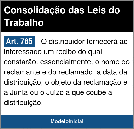 Art. 785 - O distribuidor fornecerá ao interessado um recibo do qual constarão, essencialmente, o nome do reclamante e do reclamado, a data da distribuição, o objeto da reclamação e a Junta ou o Juízo a que coube a distribuição.