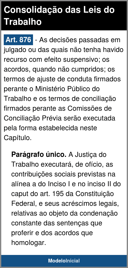 Art. 876. As decisões passadas em julgado ou das quais não tenha havido recurso com efeito suspensivo; os acordos, quando não cumpridos; os termos de ajuste de conduta firmados perante o Ministério Público do Trabalho e os termos de conciliação firmados perante as Comissões de Conciliação Prévia serão executados pela forma estabelecida neste Capítulo.