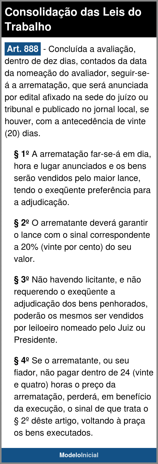 Art. 888 - Concluída a avaliação, dentro de dez dias, contados da data da nomeação do avaliador, seguir-se-á a arrematação, que será anunciada por edital afixado na sede do juízo ou tribunal e publicado no jornal local, se houver, com a antecedência de vinte (20) dias.