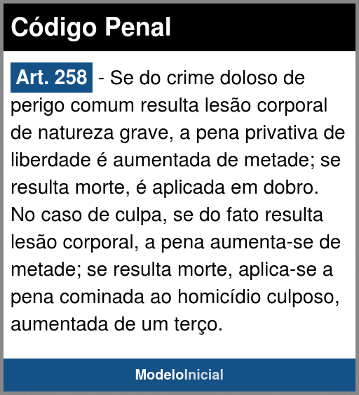 Art. 258 - Se do crime doloso de perigo comum resulta lesão corporal de natureza grave, a pena privativa de liberdade é aumentada de metade; se resulta morte, é aplicada em dobro. No caso de culpa, se do fato resulta lesão corporal, a pena aumenta-se de metade; se resulta morte, aplica-se a pena cominada ao homicídio culposo, aumentada de um terço.